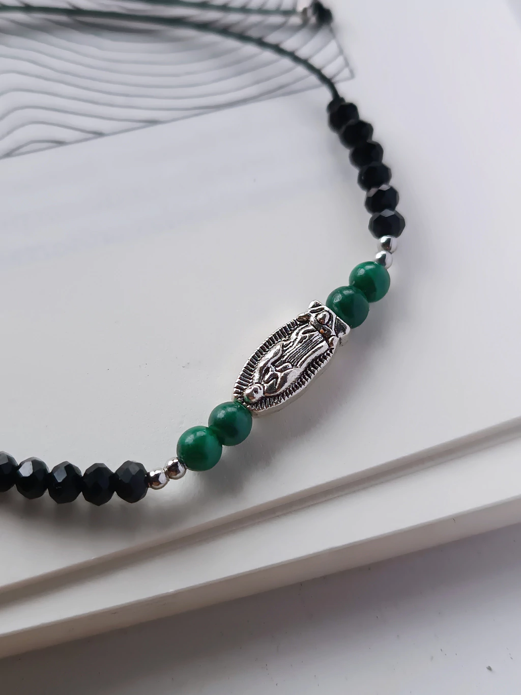 Material: Hilo de seda, cristal de roca, esferitas de acero y dije de niquel